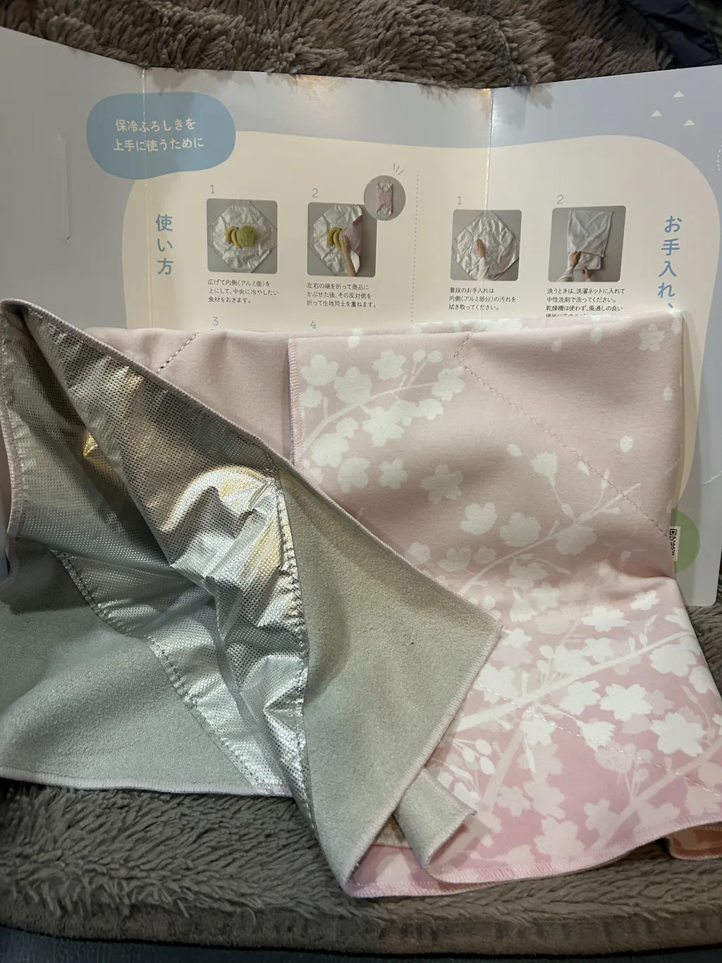 限定の桜柄の保冷バッグにあわせて、お揃いの柄でふろしきも買ってみました。中に物を入れて折りたたむと磁石でカンタンにくっつくので、とても楽でした。思ってたより大きさもあったのでお徳用パックのお肉のパックもらくらく包めるし、形を問わず包めるので助かります!