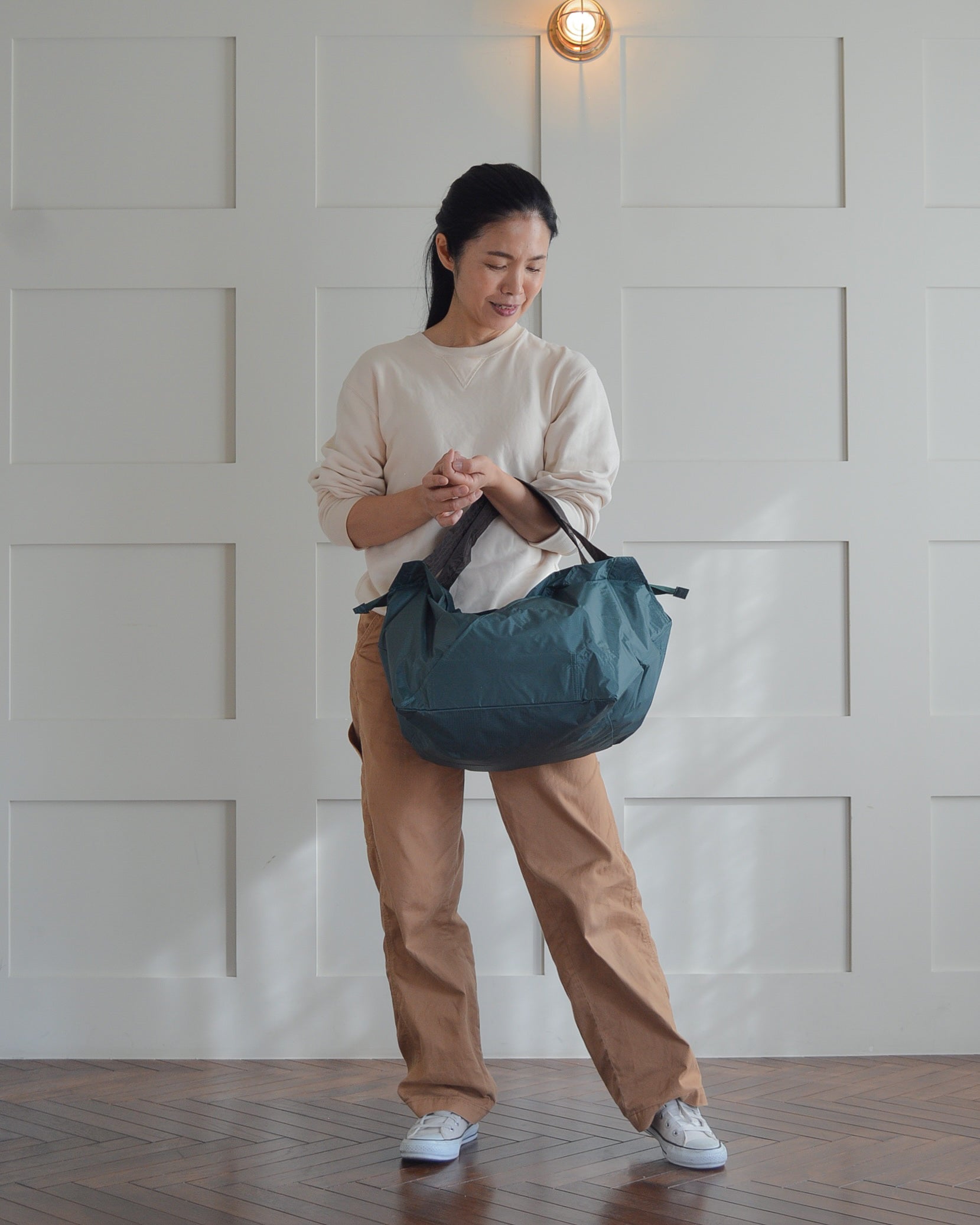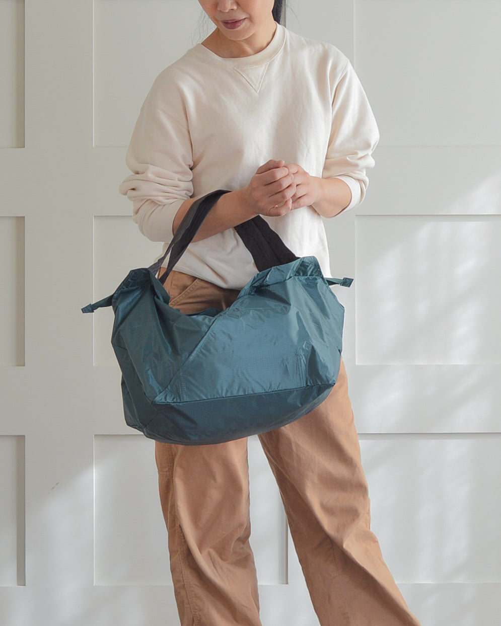 セルフレジで袋詰めに困っていませんか?ORIBAのエコバッグなら、広げてサッと詰めるだけ!広い開口部で食材や大きな商品もラクラク収納。フックでしっかり固定できるので、買い物中も安定。折りたためばコンパクトになり、持ち運びもバッチリです。