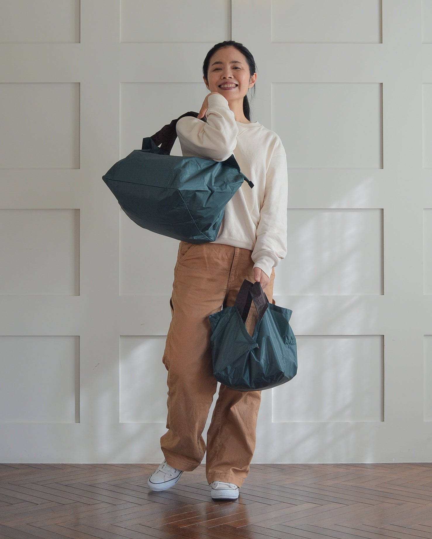 Lサイズはスーパーに、Mサイズはコンビニなどの普段の小さな買い物に使っています。自立するので袋詰めが簡単で、とても気に入っています!!