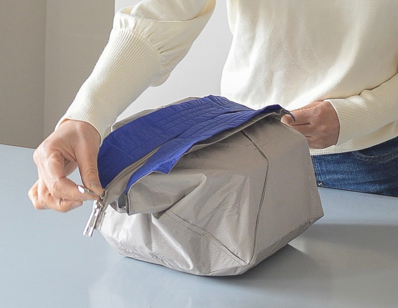 コンパクトにまとまってパッと開くのがいい。保冷も便利だけどファスナーを閉めたり、開けたあとたたむのはちょっと手間取るのでやり方を教えて欲しい。