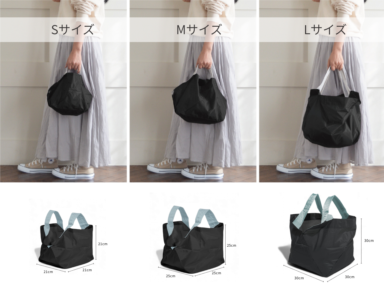 オリバは、用途やシーンに合わせてサイズを選べます。スーパーで使うなら、もちろんLサイズが最適です。Sサイズは、コンビニやパン屋さんでとっても便利、Mサイズはシーンを兼用できる万能サイズ。畳むと薄いので、複数持ちもおすすめです。