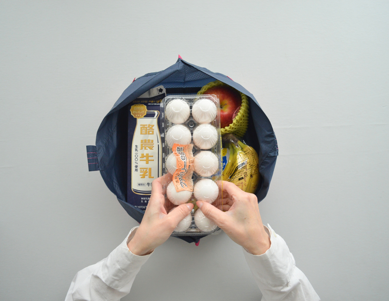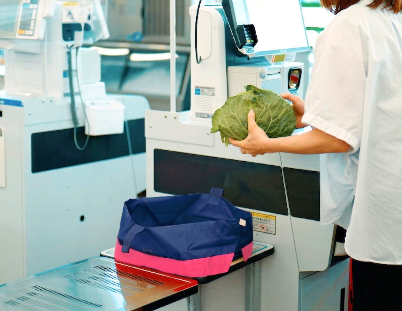 セルフレジで袋詰めに困っていませんか?オリバなら、広げてサッと詰めるだけ!広い開口部で食材や大きな商品もラクラク収納。フック掛けの難しいセルフレジでも自立して安定します。