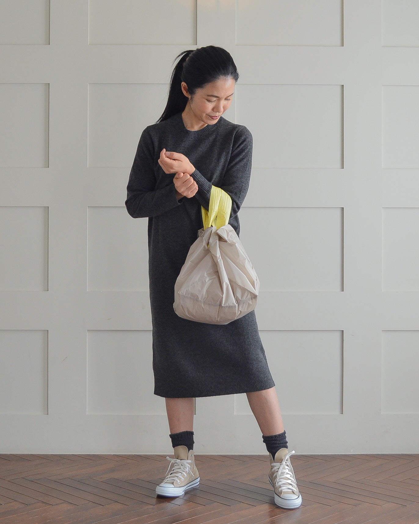 カラー: 本体 ミルクティーベージュ × 持ち手 れもんイエロー