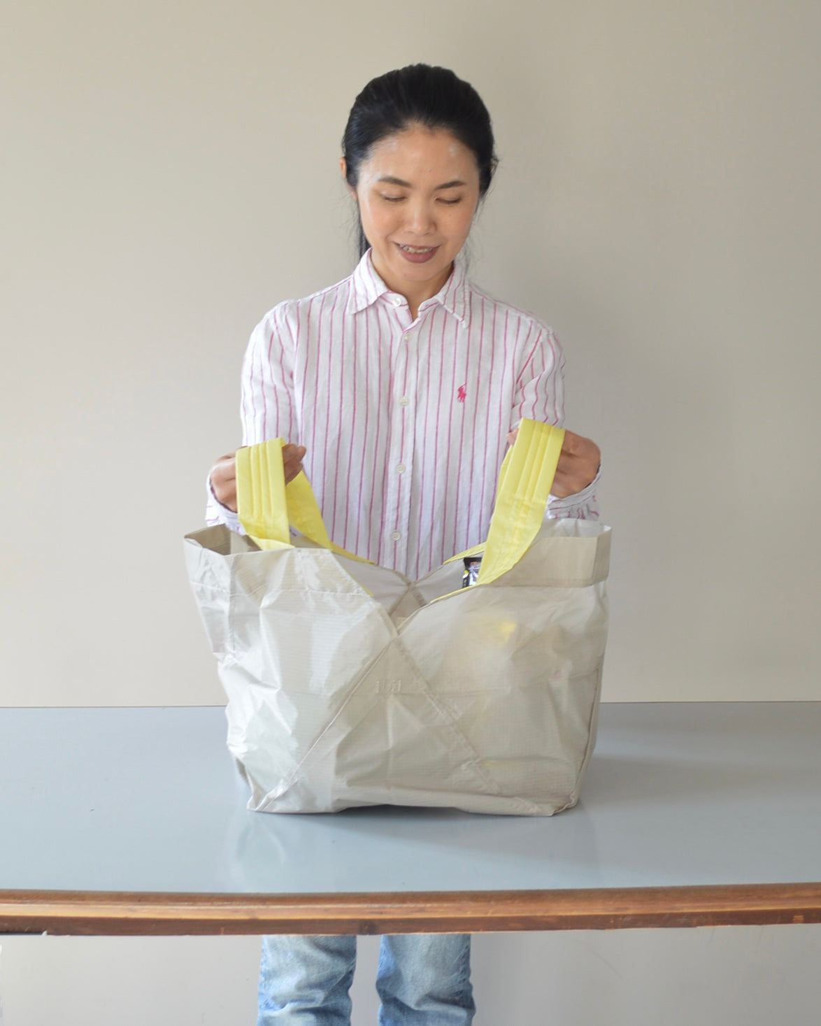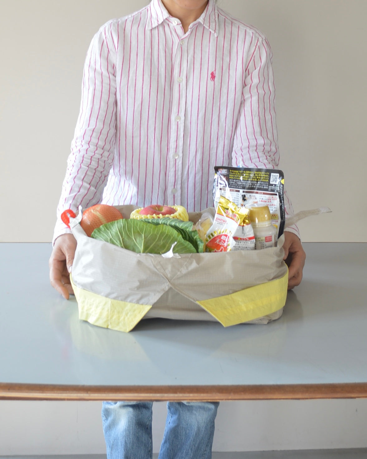袋を片手で持ち上げながら、